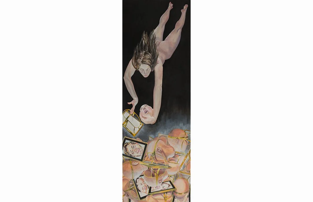 Painting depicting the tragedy of a society lost in the screen world and the possibility of awakening from it. We are hiding our true faces behind our various profiles on social media websites. Through social media and the screen world, we feel we can steer people's perception of us and in that way only show an ideal self of ourselves to the wold. In truth however, this artificial face, is flat and void of all real life aspects. Behind the screens we have become mere phantoms.