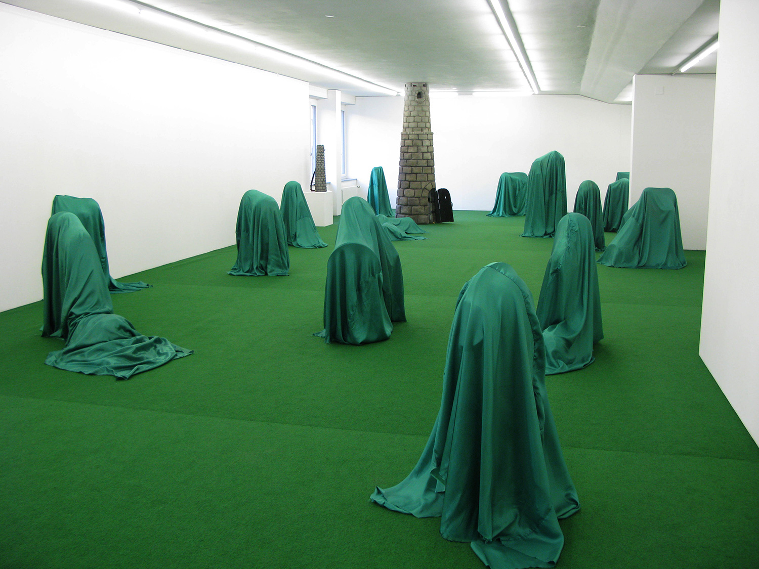 The performance is taking place in a gallery space resembling a luscious pasture with a giant bell tower soaring in its center. In this lovely setting the painful transformation from a delightful and proper singing and dancing Swiss Maiden to her inner, very erratic and threateningly awkward worm-like being takes place. It is in this transformed state that Swiss Miss gives life to all the sculptural pieces through an exhausting process of unveiling. After every character has been revealed; sculptures, reminiscent to reflections of her suppressed spontaneous aspects when everything is out in the open, the worm creature crawls into the tower, calls out a few of the previously collected confessions and rings the bell to announce and celebrate the moment of liberation. At peace now with all her aspects, the worm returns to its shed former skin, devours it and exits the scene to finally reappear dressed again as Swiss Miss, peacefully socialized, to greet the audience.